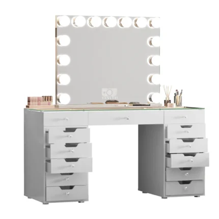 VANITII Eva Vanity Desk – 13 Storage Drawers with Full Light