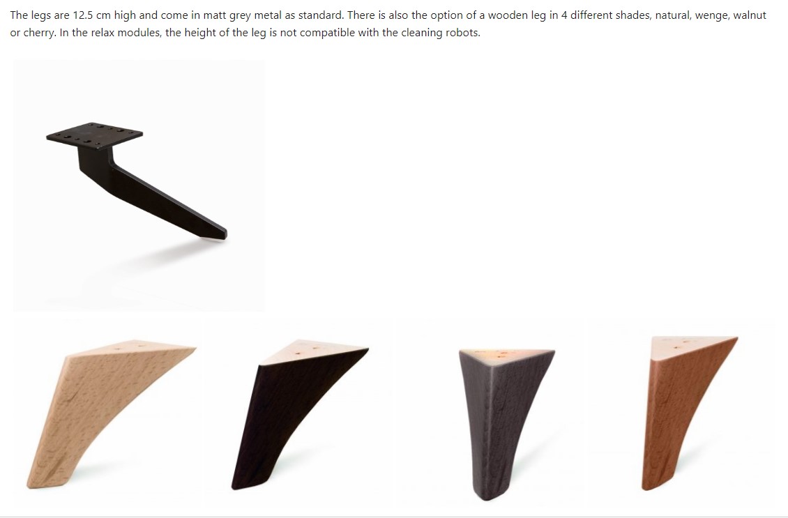 The legs are 12.5 cm high and come in matt grey metal as standard. There is also the option of a wooden leg in 4 different shades, natural, wenge, walnut or cherry. In the relax modules, the height of the leg is not compatible with the cleaning robots.