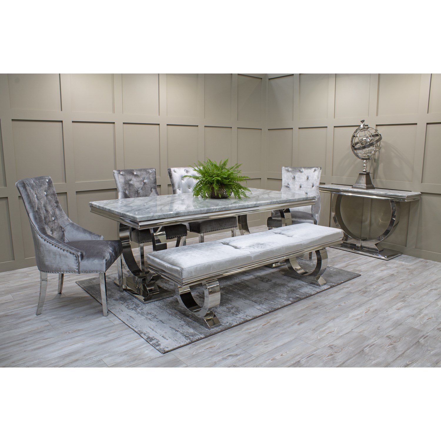 Ultra chic and high end, the Arianna is the ultimate dining collection for those who crave style and glamour. Its unique marble top is supported by a polished stainless steel base.Features:- Natural Marble Patterns