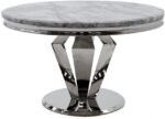 The Arturo is a contemporary dining collection with billowed stainless steel legs and grey marble top.