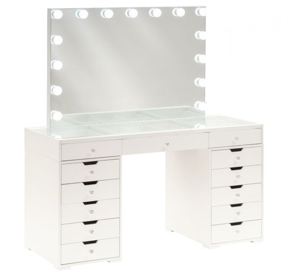 Get ready in style with this stunning Hollywood-style dressing table & mirror set. The led bulb surround offers the optimum lighting to get your makeup right, whilst the 13 spacious storage drawers offer the perfect place to store your makeup and accessories.