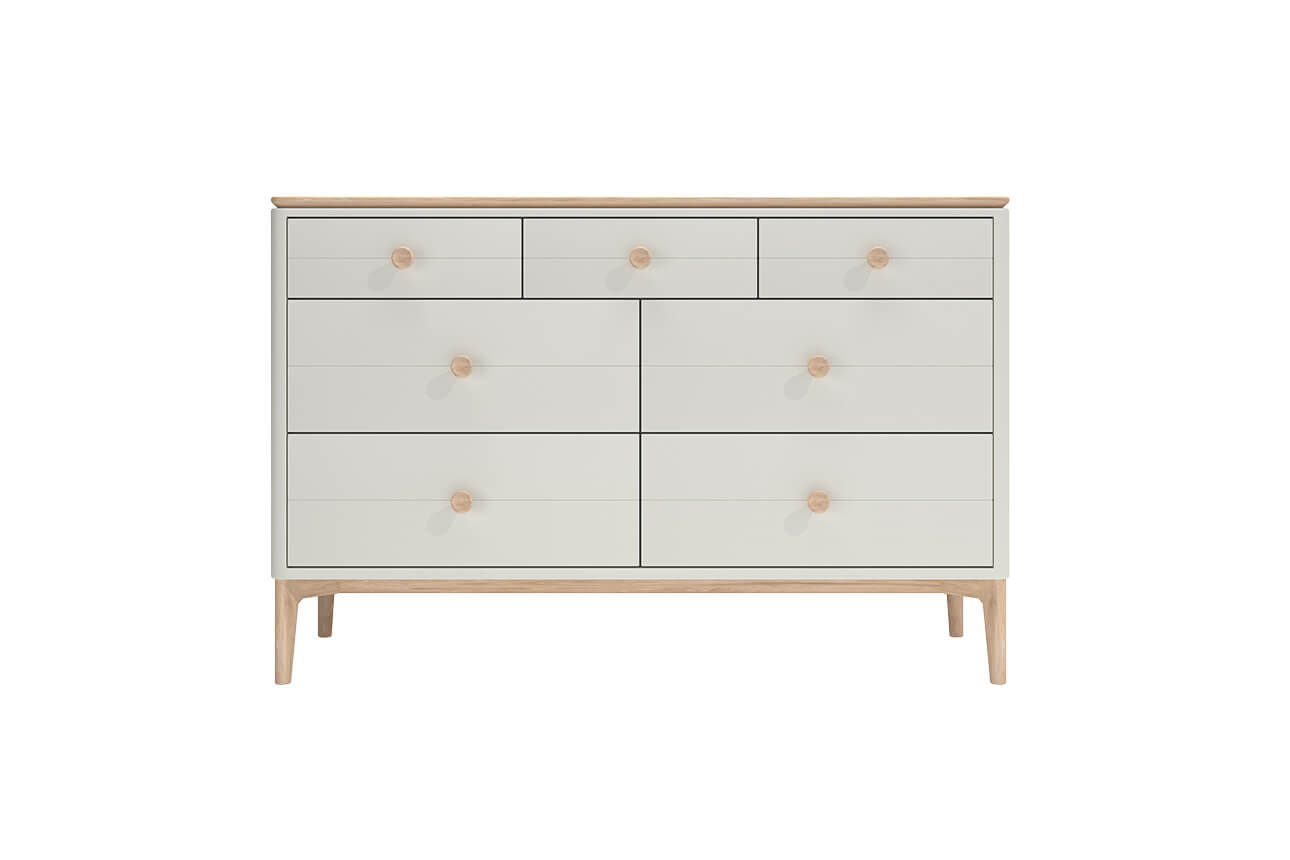 Introducing the Marlow wide chest by VIDA, an elegant and modern seven-drawer piece crafted from American white oak. Taking inspiration from Scandi design, this wide chest offers generous proportion and timeless sophistication for any bedroom. With deep storage drawers and a practical soft close system, this chest is designed with convenience in mind. For even more storage space and to complete your bedroom layout, it is part of a full range of Marlow bedroom products. Refined simplicity defines the Marlow collection; its understated elegance makes it suitable for any contemporary interior. Versatile and stylish, with a neutral finish that will add warmth to your home decor.