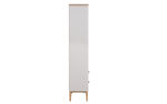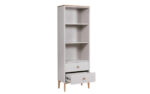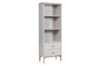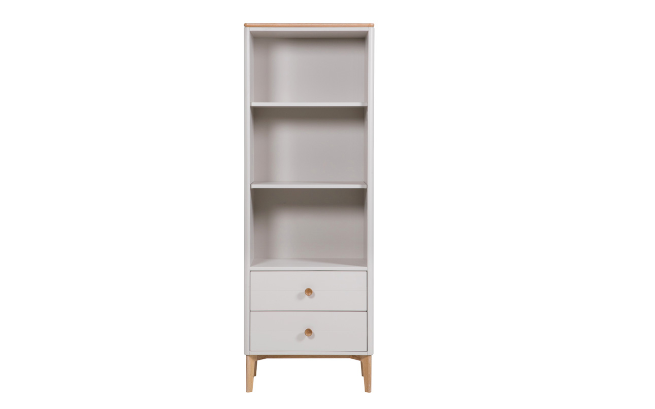 Introducing the Marlow open storage unit by VIDA. This stunning Scandinavian-inspired piece is crafted using only the highest quality American white oak and finished with a soft dove grey paint. Featuring two drawers and three shelves, the top shelf measures 304mm and provides ample space for your display items or personal belongings.