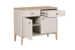 Crafted from beautiful American white oak and painted in a soft dove grey, this Scandi-style small Marlow sideboard will bring an air of sophistication and style to any home. With two doors and two drawers offering plenty of storage space, you’ll also discover there’s an adjustable internal shelf behind each door.