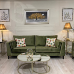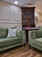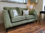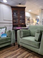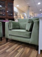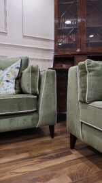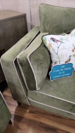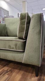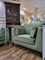 Previously showcased prominently in front of our showroom window, its trendy green color adds a contemporary touch. The Mia Sofa is available in various fabric options and can be part of a suite, offering versatility and customization with 100s of colors available. Elevate your living space with this remarkable sofa, combining style, craftsmanship, and comfort. Experience the Mia Sofa’s allure and make a statement in your home today.