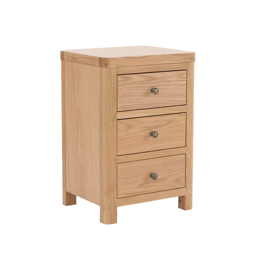 Renata Bedside Table in Oak – a harmonious blend of durability and style. Crafted from solid oak and oak veneer, its smooth rounded edges and flush sides create a clean and modern aesthetic. Adorned with brushed metal handles and equipped with three smooth-running drawers, this bedside table offers both sophistication and functionality, making it the perfect complement to any bedroom decor.