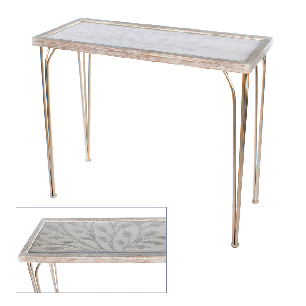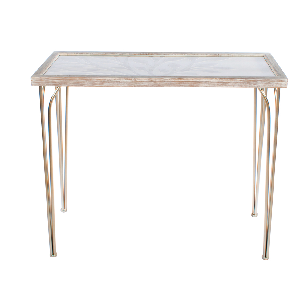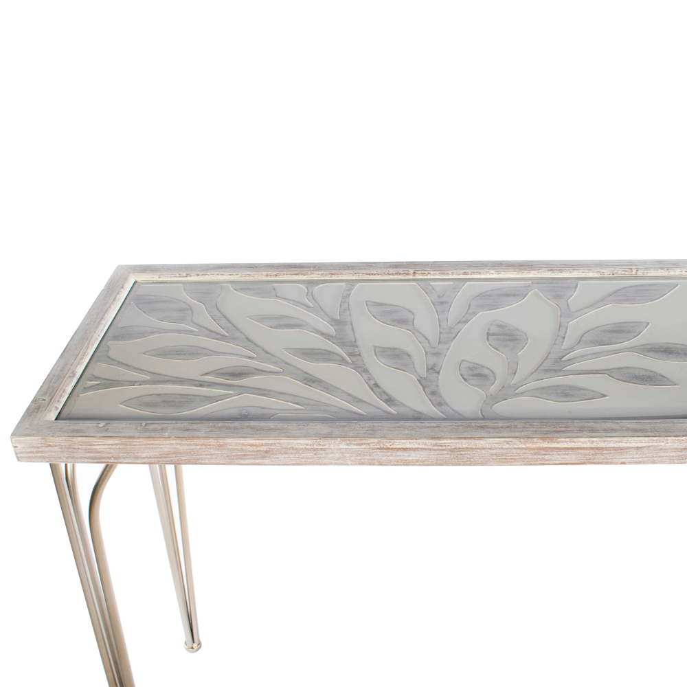 This piece has a laid-back slightly tropical island vibe thanks to the carved wooden top with its tree pattern and soft white painted finish. Champagne metal legs add a contemporary touch. A lovely console for an informal living space or hallway.